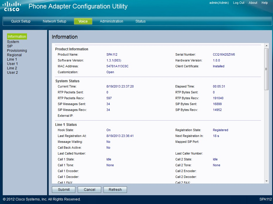 Anmerkung Es gibt zwei Methoden um die IP-Adresse Ihres Telefons zu erfahren: 1. Wählen Sie an einem am Adapter angeschlossenen Telefon vier mal Sternchen "****" und danach im IVR-Menu die "110#". Es folgt die automatische Ansage der IP-Adresse Ihres Adapters. 2. Schauen Sie nach der IP-Adresse in der ARP-Tabelle Ihres Routers nach, der Adapter wird als "SPA112" erkannt. |