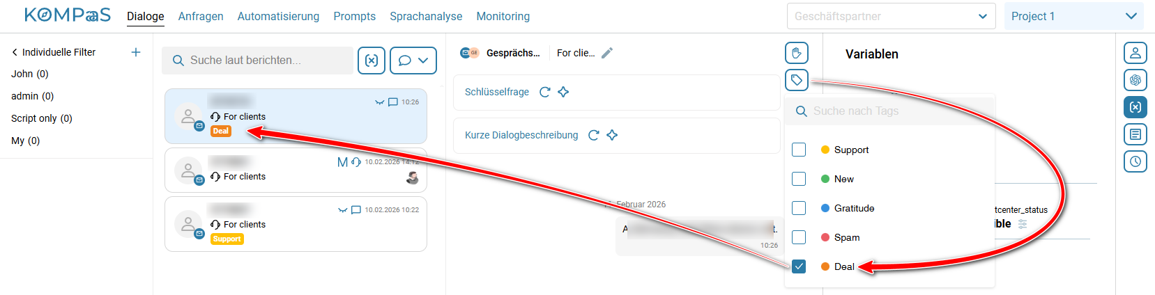 • Der Tag wird im Bereich 'Dialoge' zugewiesen.