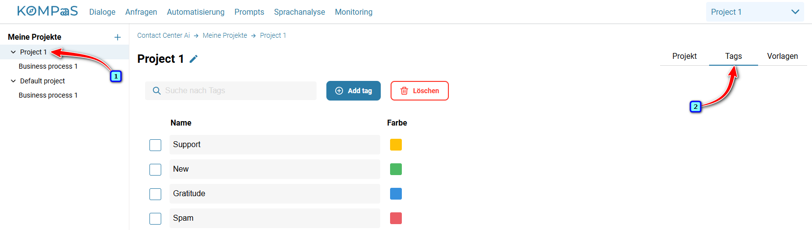 Contact Center AI → Dialoge → Tags
