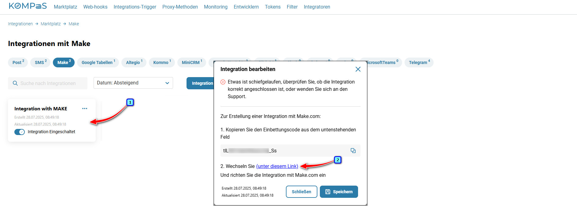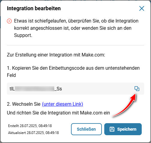 Öffnen Sie die erstellte Integration und folgen Sie dem Link zur Seite „Make“.