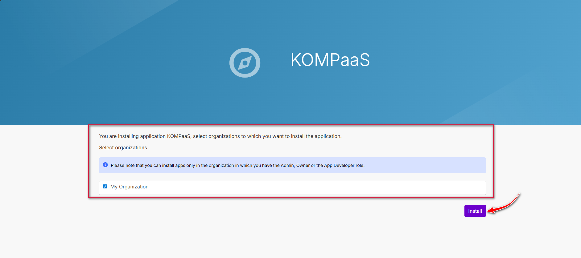 Wählen Sie die gewünschte Organisation aus und klicken Sie auf „Install“.