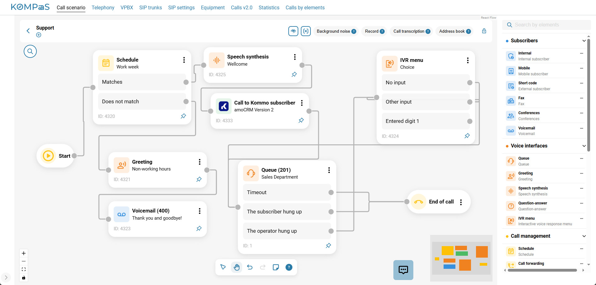 Using the “Call to subscriber Kommo” element, the customer’s call is forwarded to the responsible manager’s phone number. When an incoming call arrives, the customer card opens in an external CRM so that, based on the customer card, the system can determine the responsible manager and route the call to them.
