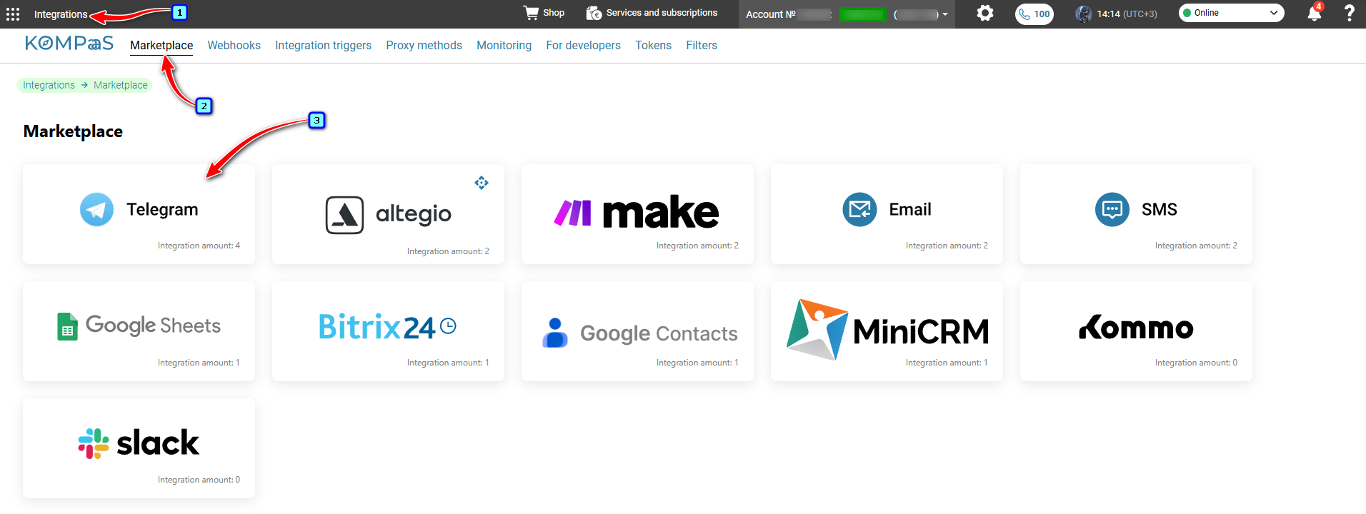 Go to the 'Marketplace' section and select the Telegram integration.