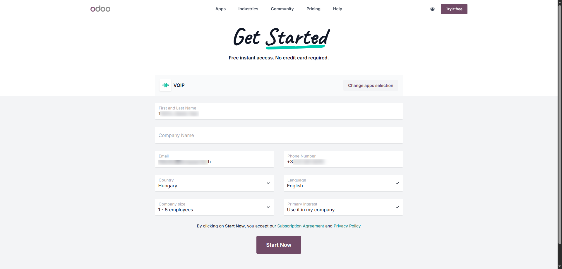 Fill in the registration details for the selected module and click the 'Start Now' button.