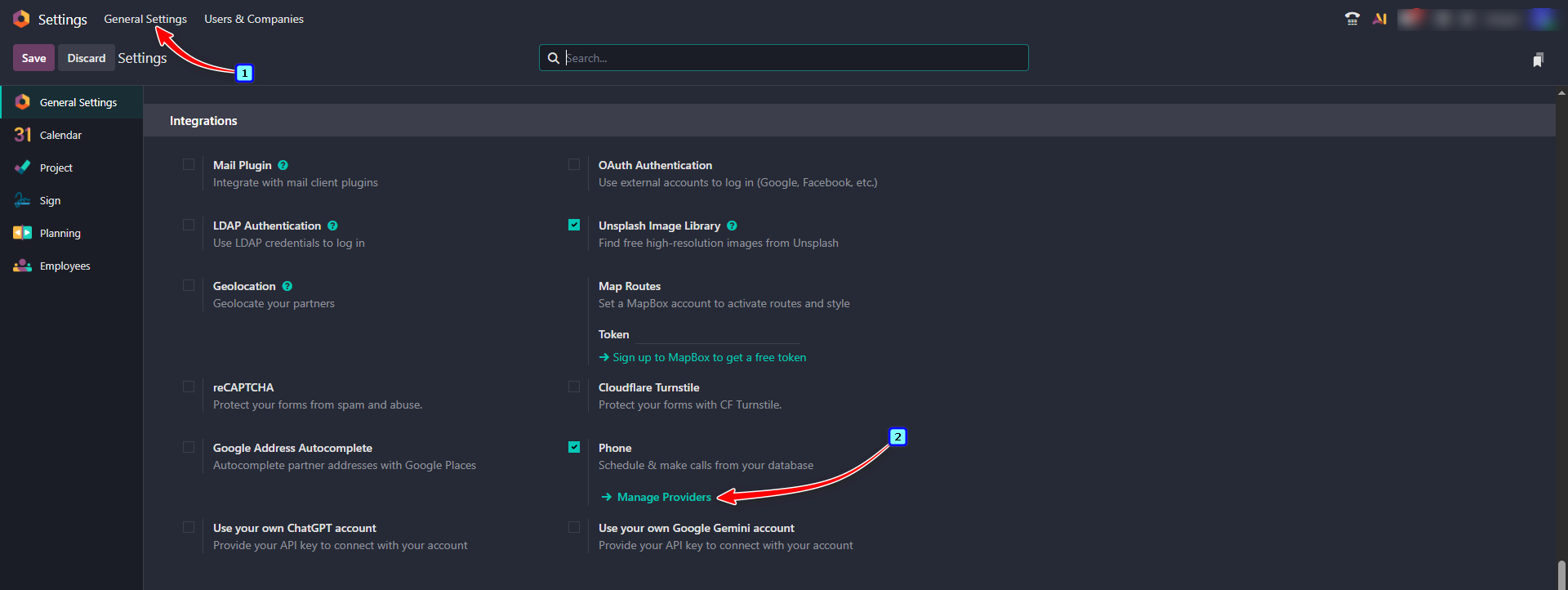 Now on the 'General Settings' tab → 'Integrations' section → open 'Manage Providers'.