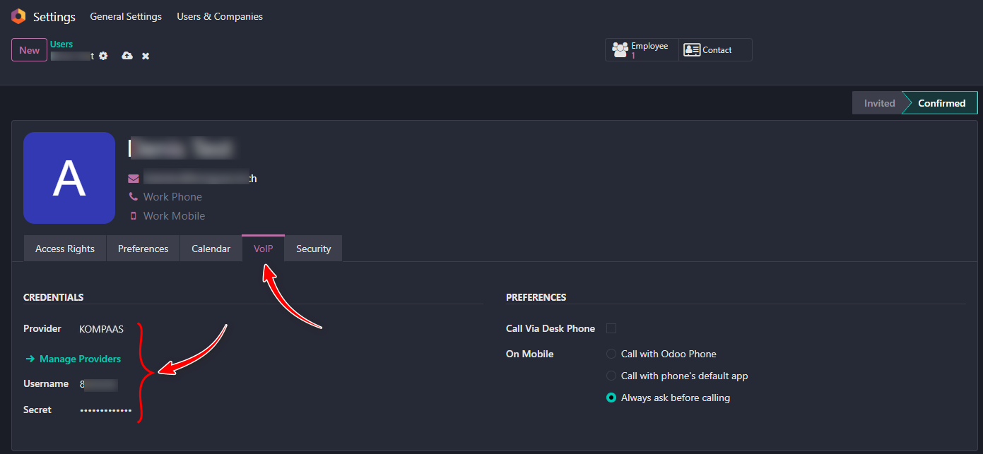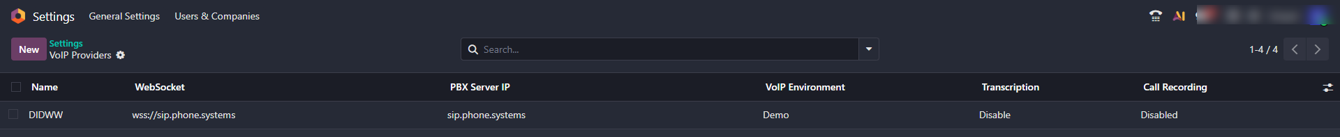 Next, go to the user settings and fill in the SIP account credentials.