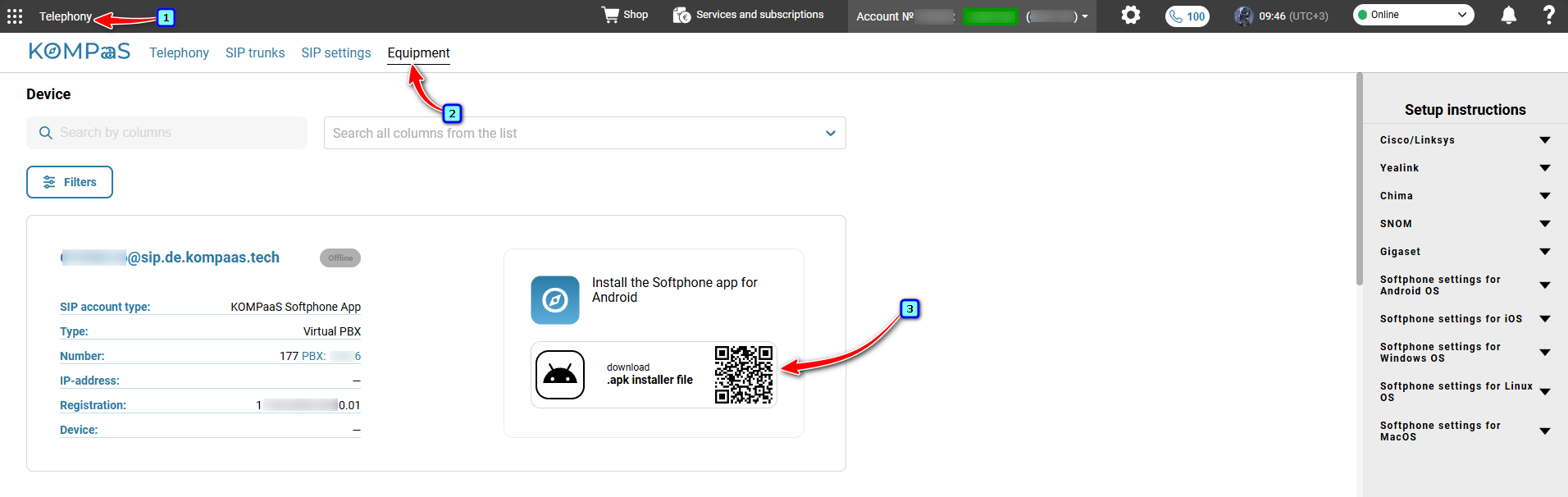Download and install the softphone on your smartphone from the 'Telephony' section → 'Equipment' tab. Or use the direct link.