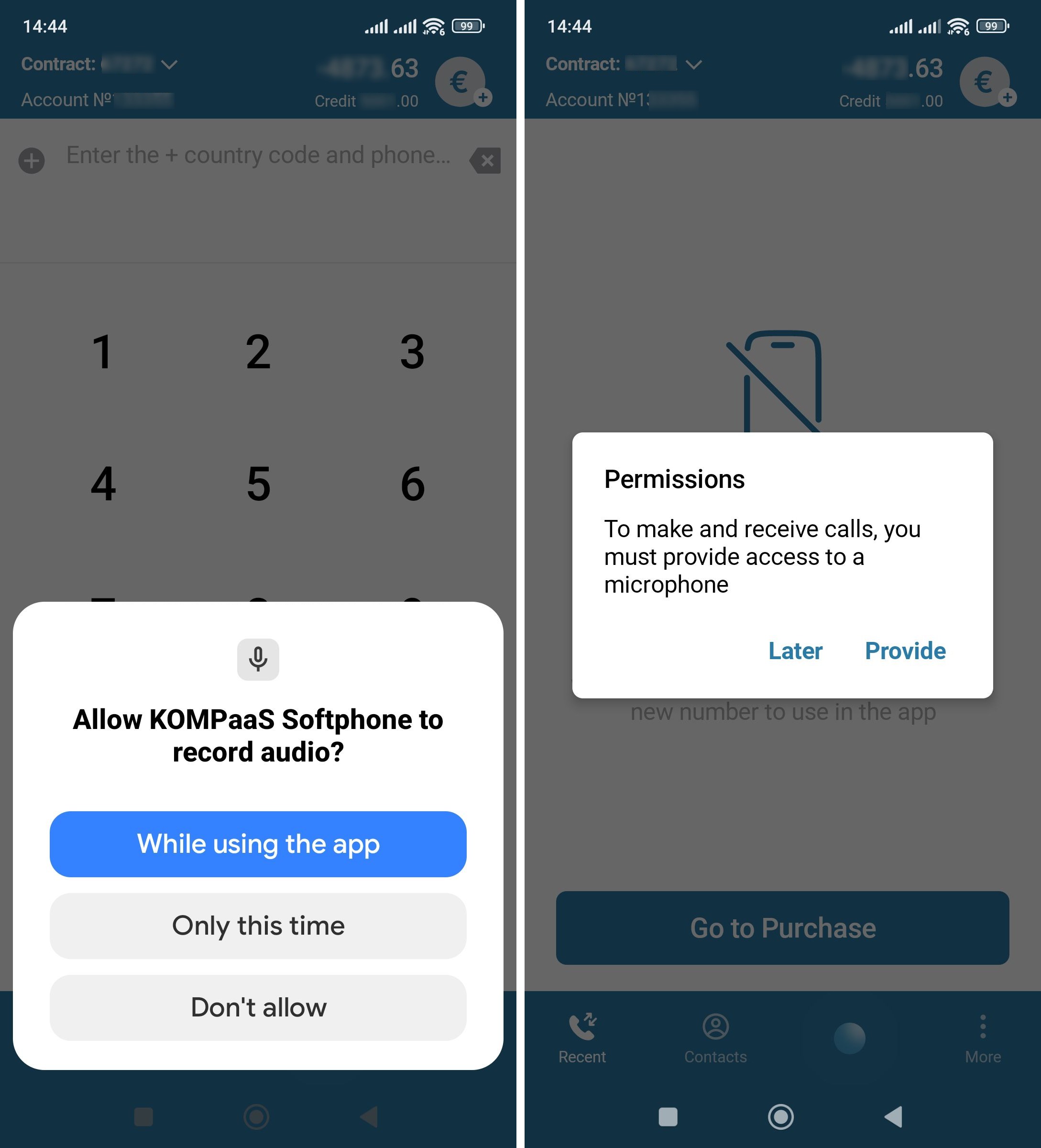 Grant permissions to the microphone and for audio recording. This is a standard permission for working with the microphone in third-party SIP applications that use their own call handling.