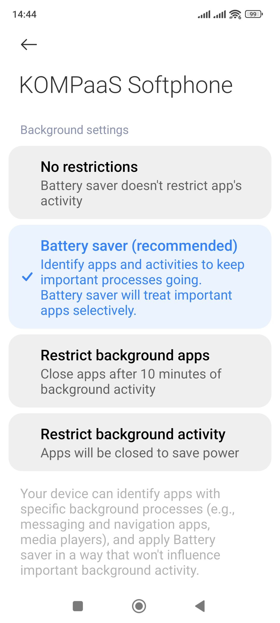 Background activity control — select "No restrictions" to prevent the application from going into "sleep" mode, which would lead to missed calls or disconnection from the SIP server.