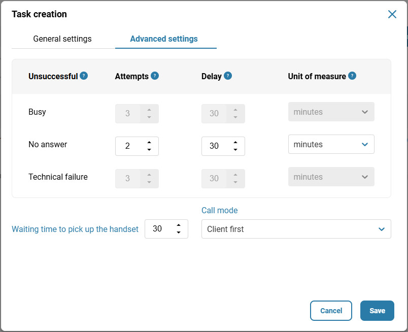 Attempts — the maximum number of attempts for unsuccessful call types (busy, no answer, technically unsuccessful).