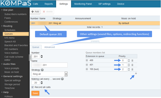 - Realice la configuración general de la cola en la pestaña Cola. Establezca la prioridad en la lista de extensiones por número (si es menor, entonces mayor).