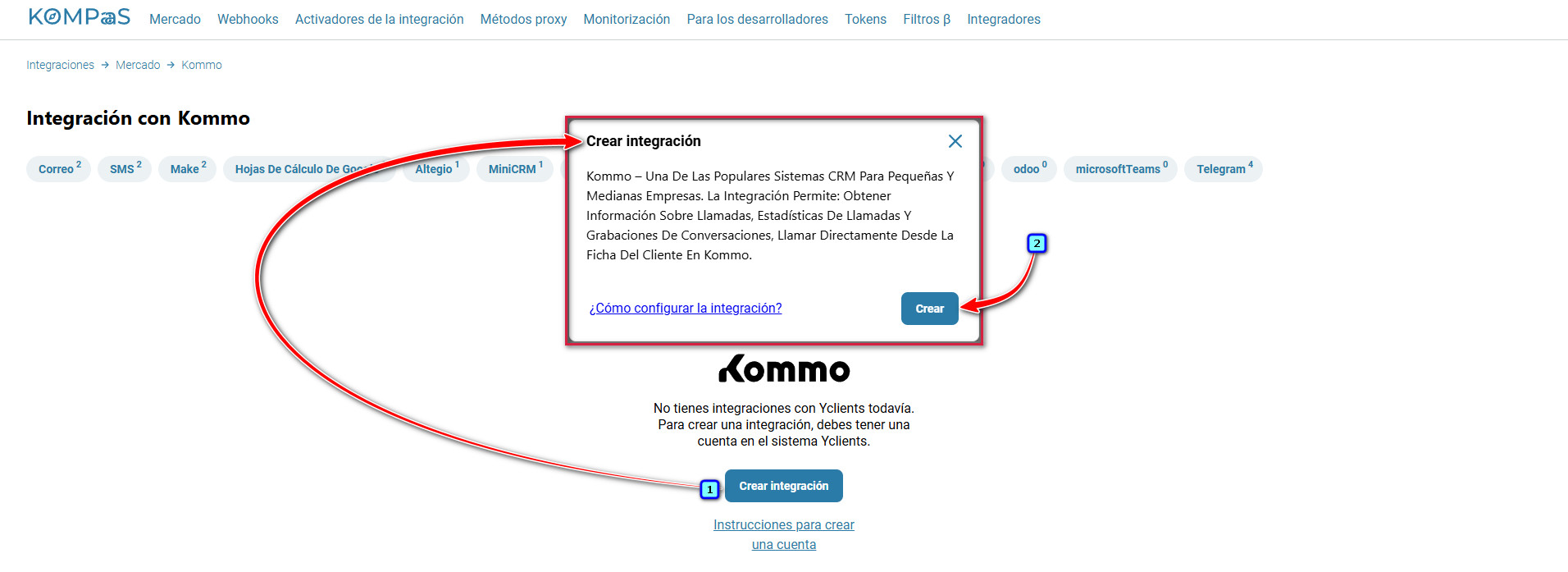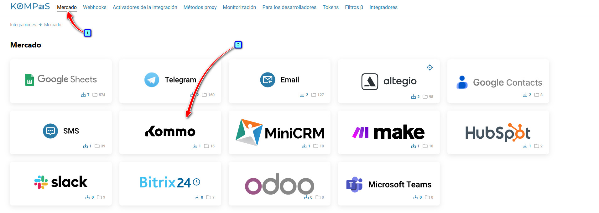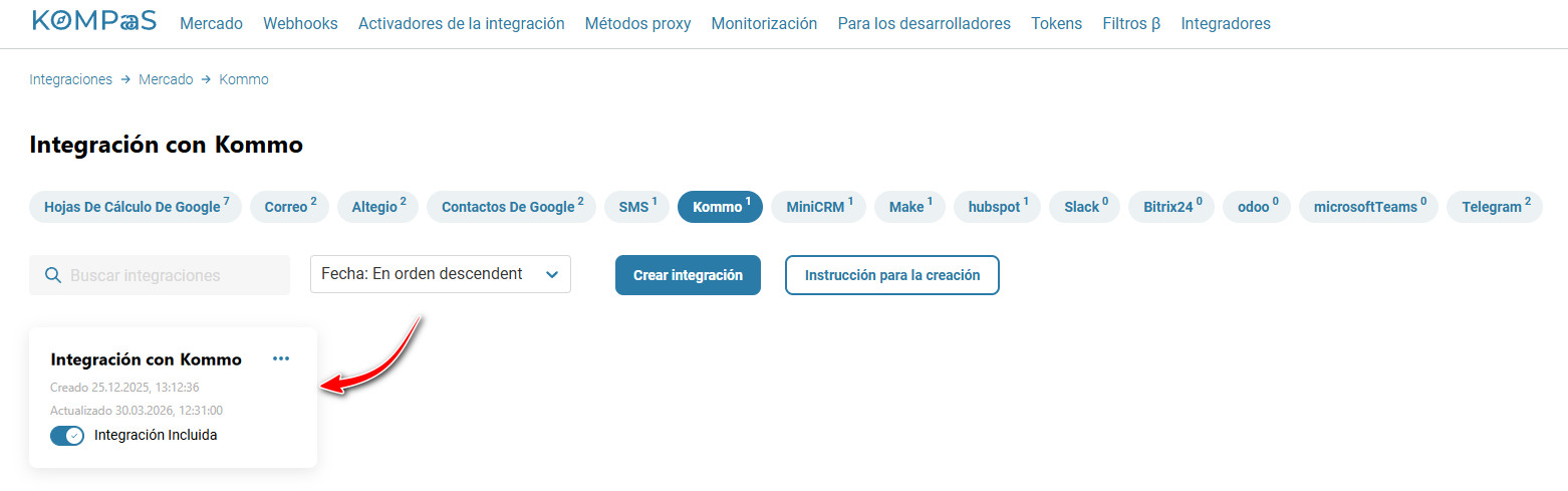 Para crear una integración, vaya a la sección ‘Integraciones’ → la pestaña ‘Mercado’ → el bloque 'Kommo'.