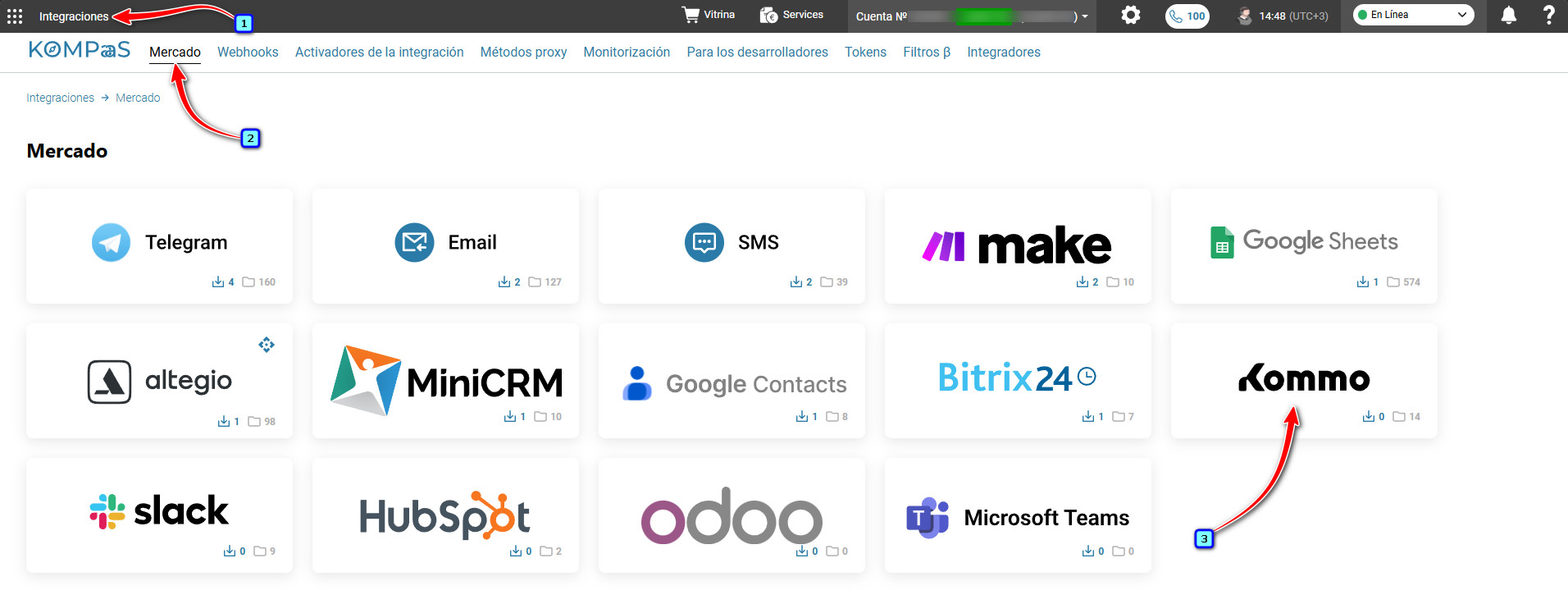 Tras conceder el acceso correctamente, se le redirigirá de nuevo a la sección ‘Integraciones’ → a la pestaña ‘Mercado’, donde podrá ver la integración creada con Kommo. Haga clic en el bloque.