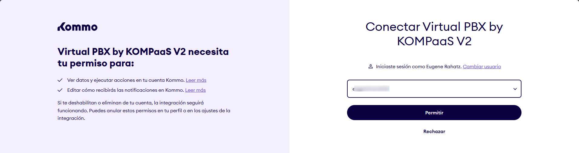 A continuación, debe elegir una cuenta y conceder acceso a ‘Virtual PBX by KOMPaaS V2’.