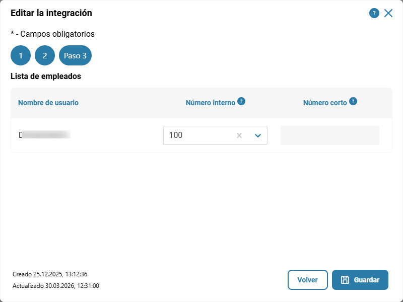 En el tercer paso, es necesario completar la ‘Lista de empleados’ — aquí debe establecer la correspondencia entre los usuarios de la cuenta de Kommo y los números internos de la centralita virtual.