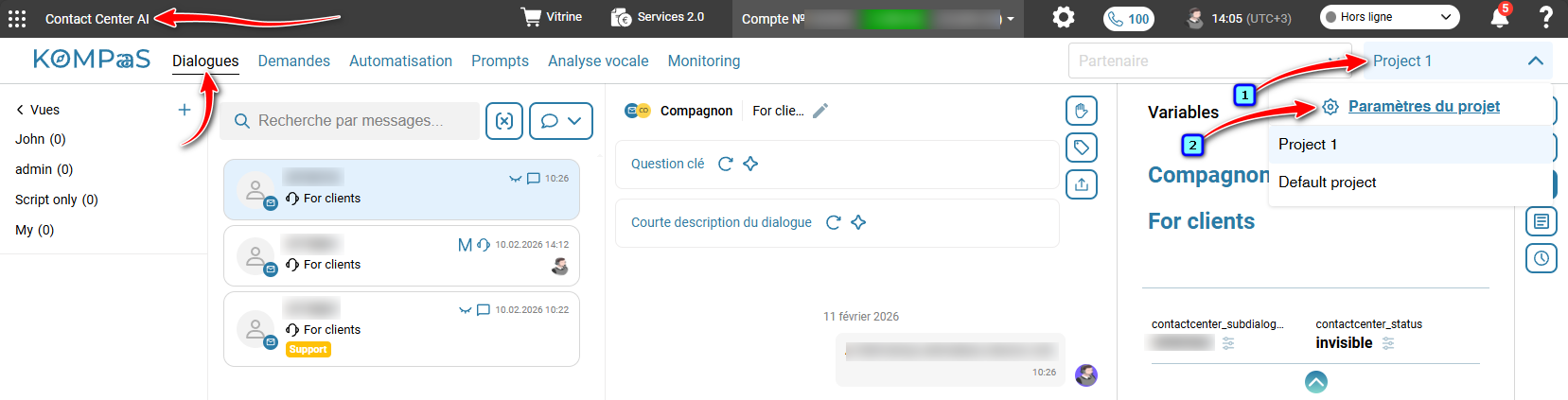1. Accédez à la section 'Contact Center AI' → 'Dialogues' → menu déroulant des projets 'Paramètres du projet'.