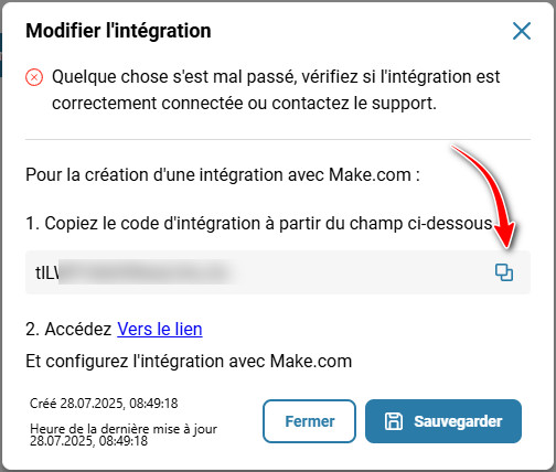 • Code d’intégration — dans la section «Intégrations» → onglet «Marché» → dans le bloc «Make» de l’intégration créée.
