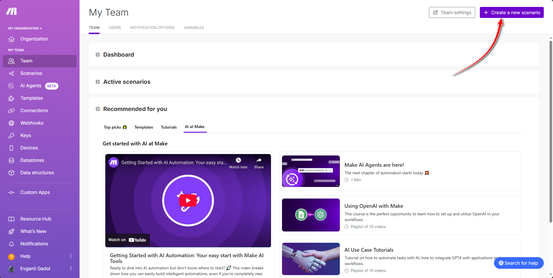 1. Dans l’espace personnel Make, dans la section «Team» → onglet «Team», cliquez sur «Create a new scenario».