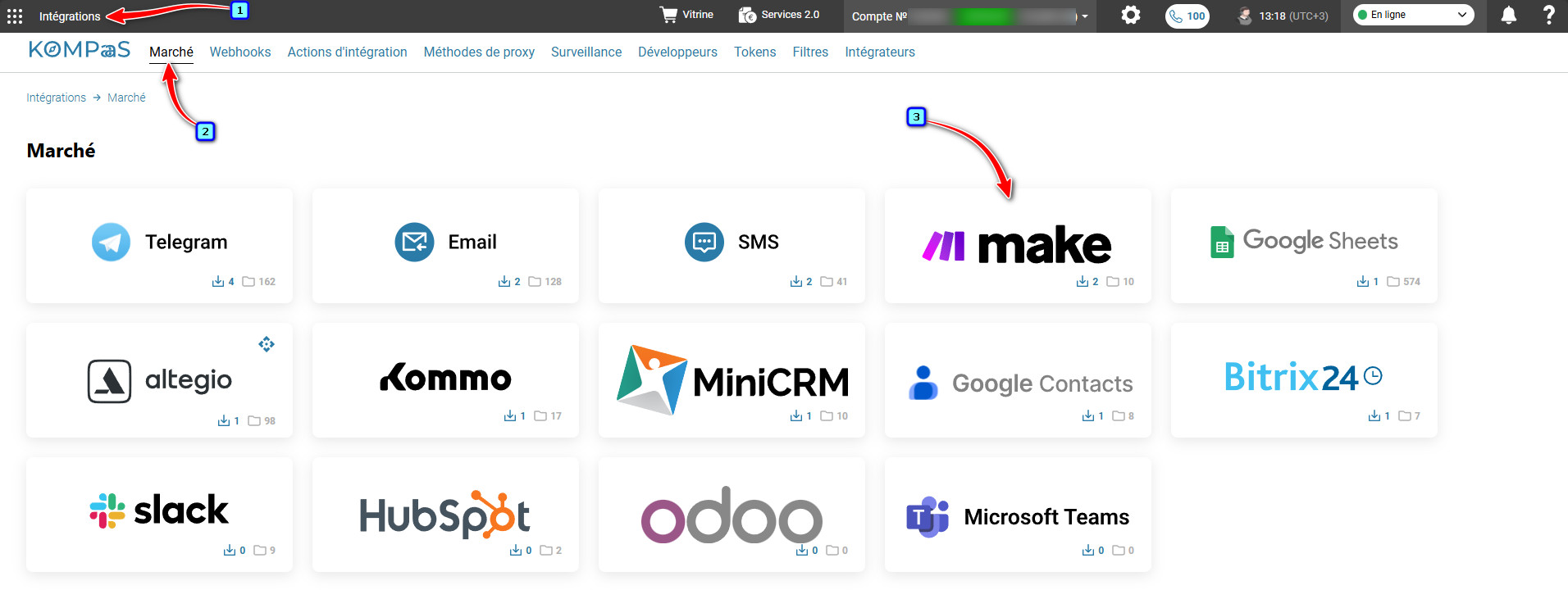 1. Accédez à la section «Intégrations» → onglet «Marché» et cliquez sur le bloc «Make».