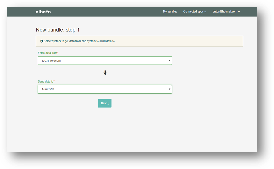 Válassza az MCNtelecom rendszert, amelyből adatokat kíván kigyűjteni, és a miniCRM-et, mint második rendszert, amelybe az adatok átkerülnek.