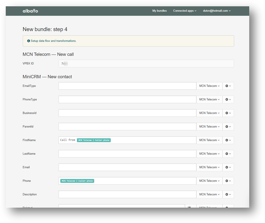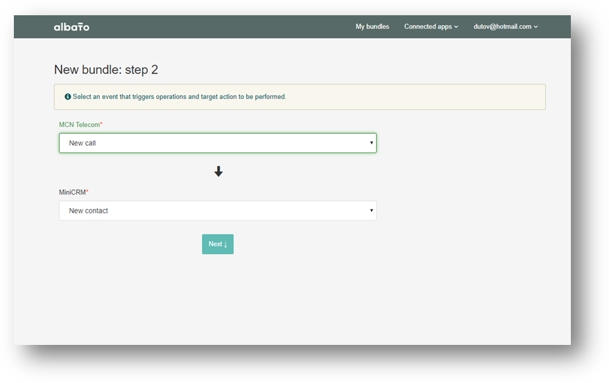 Elsősorban el kell végezni a regisztrációt az Albato weboldalán, ami ingyenes. Ezután kattintsunk a «Connected apps» majd válasszuk ki az MCN Telecomot és a miniCRM-et.