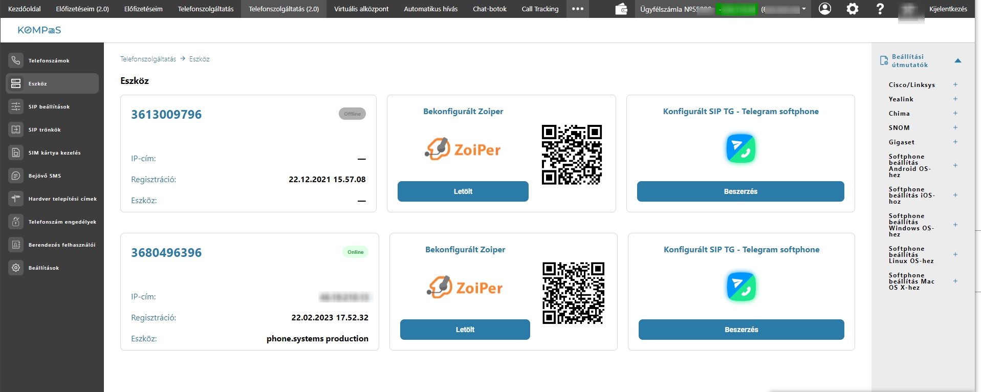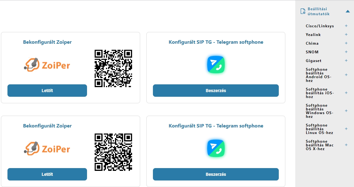 A «Telefonszolgáltatás 2.0 | Eszköz» menüpont alatt, lehet megtekinteni a softphone beállítási útmutatókat előre telepitett beállításokkal. A «Telefonszolgáltatás 2.0 | SIP beállítások» menüpont alatt pedig megtalálhatóak a részletes SIP adatok.