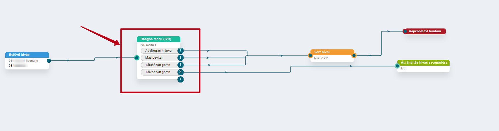 A vállalat telefonszámán, a "Hangmenü" (IVR menü) elem használatával engedélyezze a konferenciába történő átvitelt, amikor az egyik számot tárcsázzák