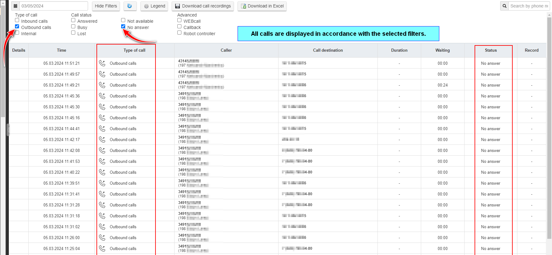 Hívások a szűrőn keresztül - A hívésok a szűrési mechanizmus segítségével rendezettek. A szűrőmechanizmus lehetővé teszi a bejövő, kimenő és belső hívások, valamint a "Hívás Web-oldalról" szolgáltatást használó hívások kiemelését. A szűrési mechanizmust egyszerre az összes hívásra, valamint egyetlen előfizető vagy hívási sor hívásaira is használhatja.