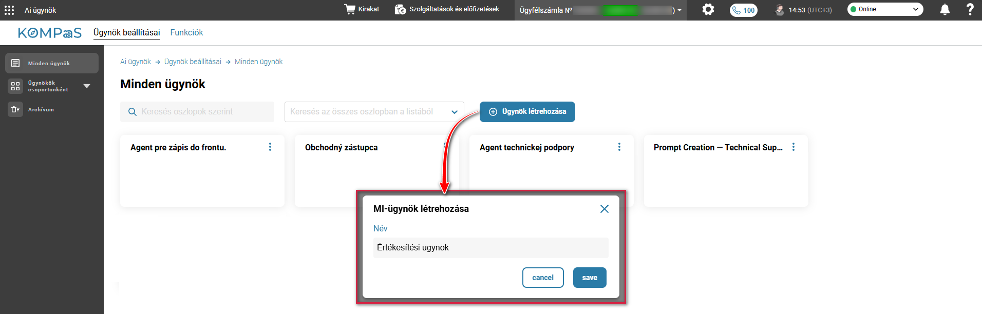 KOMPaaS AI ügynök — egy univerzális virtuális asszisztens, amely 24/7 tanácsot ad az ügyfeleknek, megoldja a tipikus feladatokat és tehermentesíti az ügyfélszolgálatot. Lásd: 'Hogyan csatlakoztassuk az AI-ügynököt'.