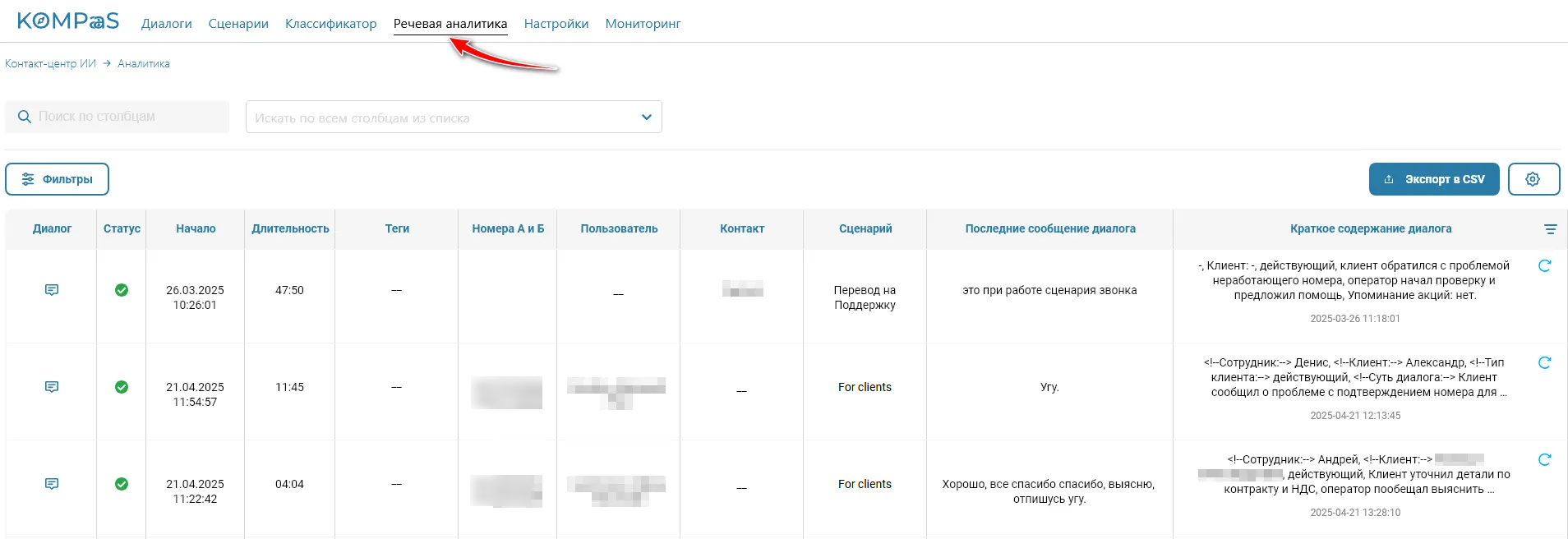Результаты аналитики речевых диалогов отображаются в таблице.