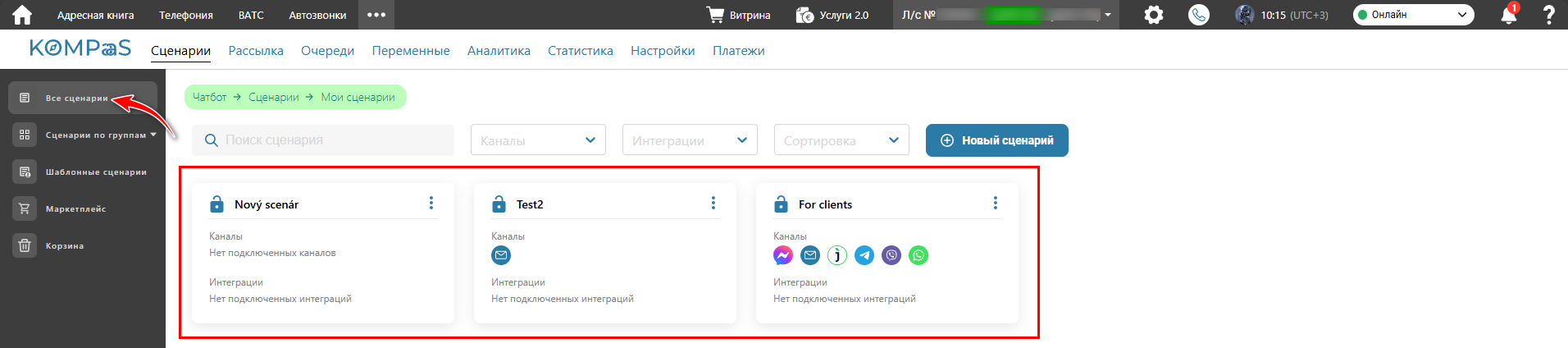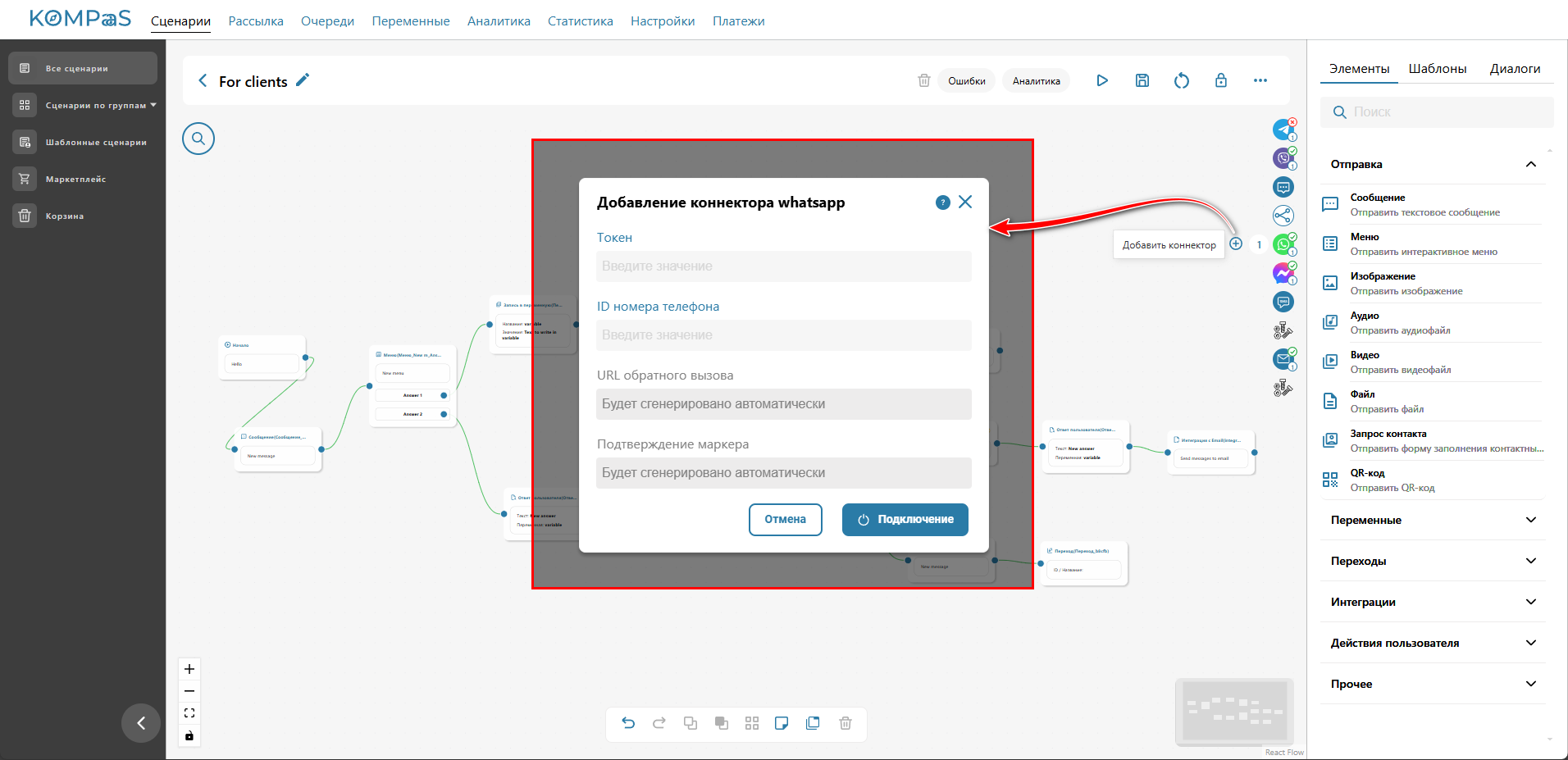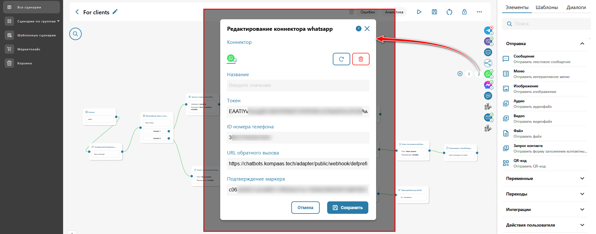 Перейдите в раздел ‘Чат-боты’ → вкладка ‘Сценарии’ → меню слева 'Мои сценарии' и откройте сценарий, где требуется создать канал WhatsApp.