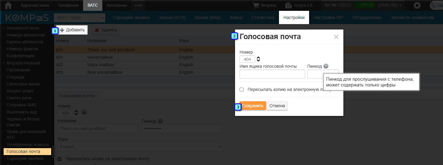 Для создания нового ящика голосовой почты нажмите кнопку «Добавить».