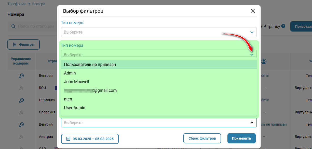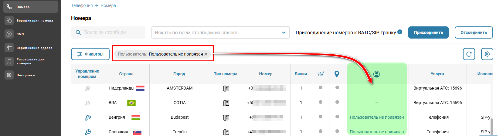 Для удобства поиска номеров, к которым не привязан пользователь, можно воспользоваться фильтром.