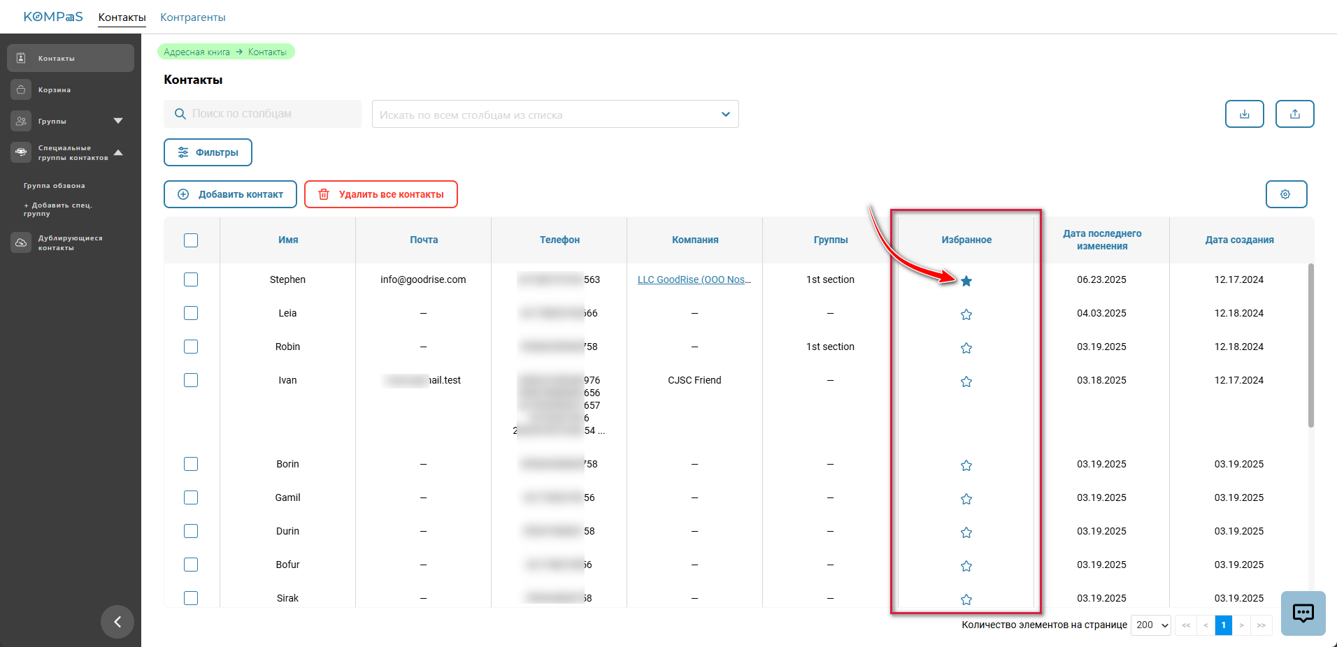 Для этого в разделе ‘Адресная книга’ → вкладка 'Контакты' напротив контакта в столбце ‘Избранное’ нажмите на звёздочку.