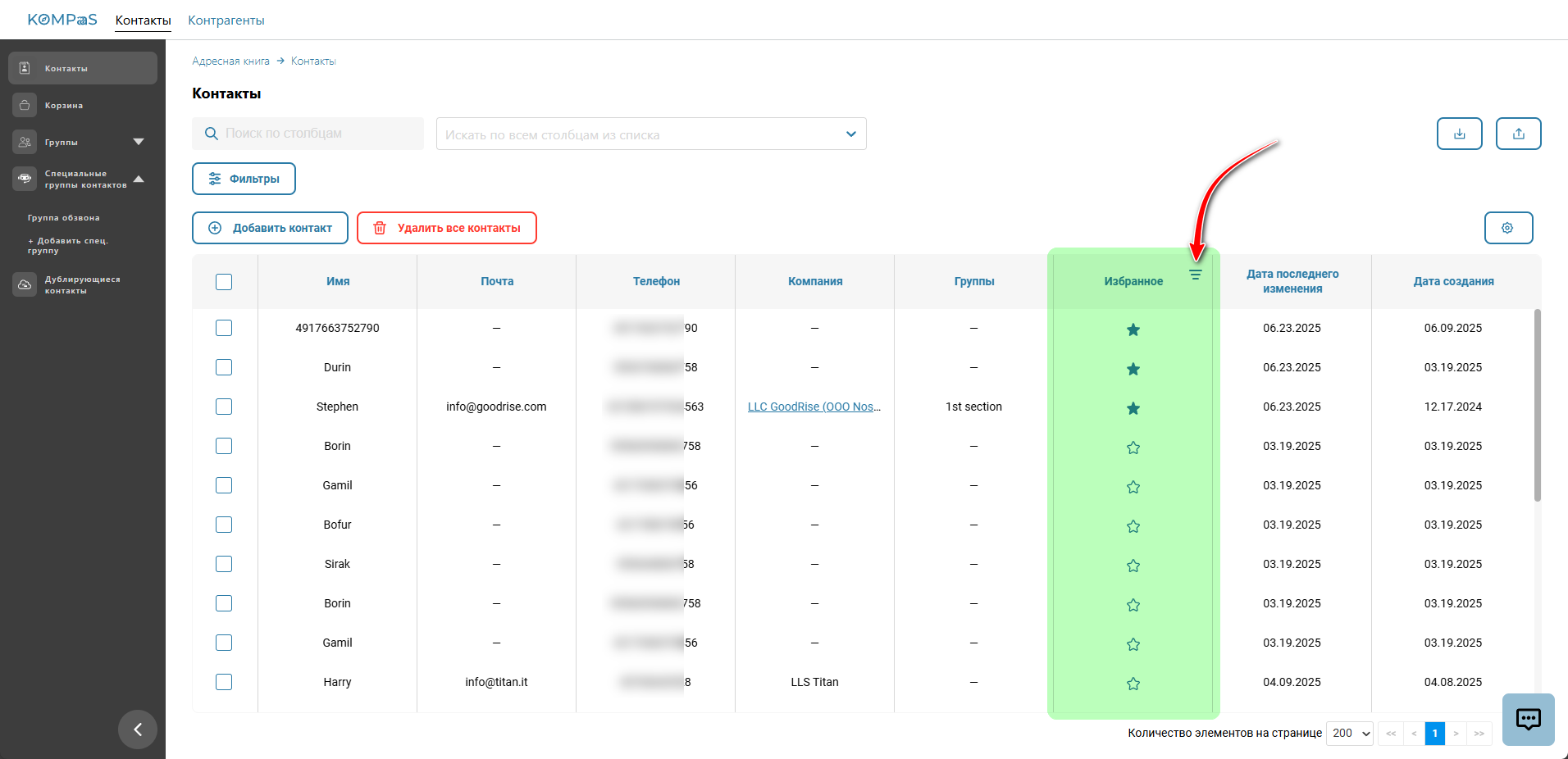 Отсортируйте контакты, чтобы отобразить все избранные контакты.