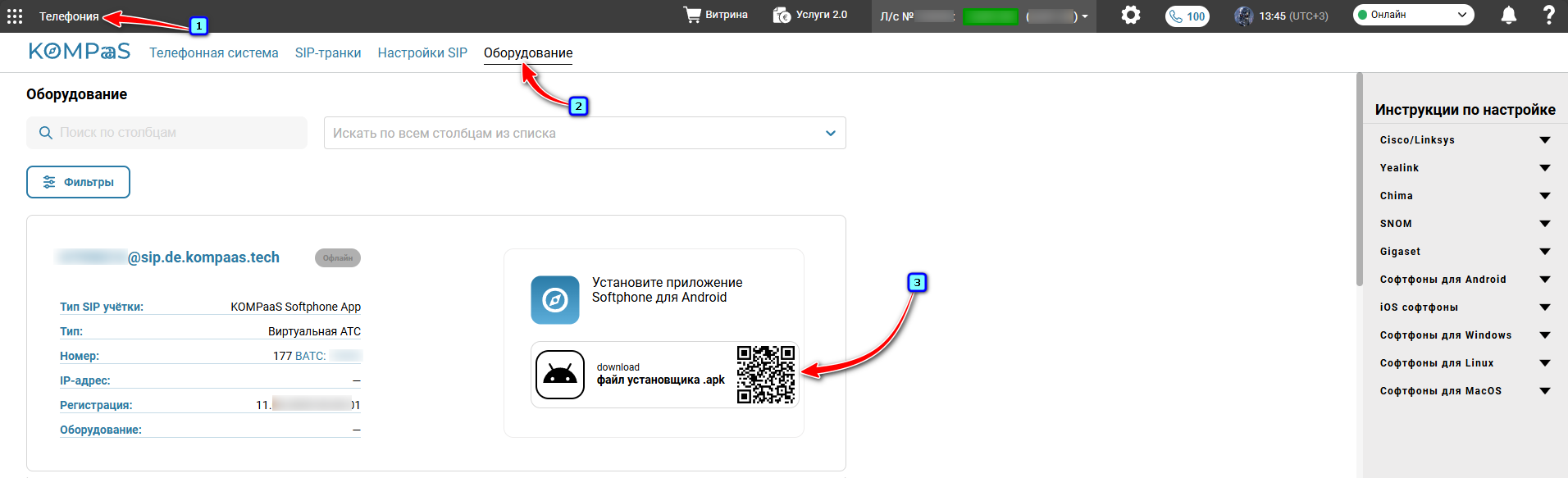 Загрузите и установите софтфон на ваш смартфон по ссылке или воспользуйтесь быстрой загрузкой приложения с помощью QR-кода в разделе 'Оборудование'.