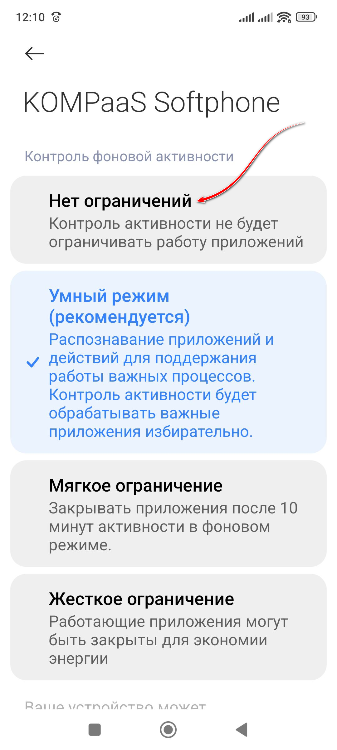 Управление фоновой активностью — выберите ‘Нет ограничений’, чтобы предотвратить переход приложения в "спящий" режим, который может привести к пропущенным вызовам или отключению от SIP-сервера.
