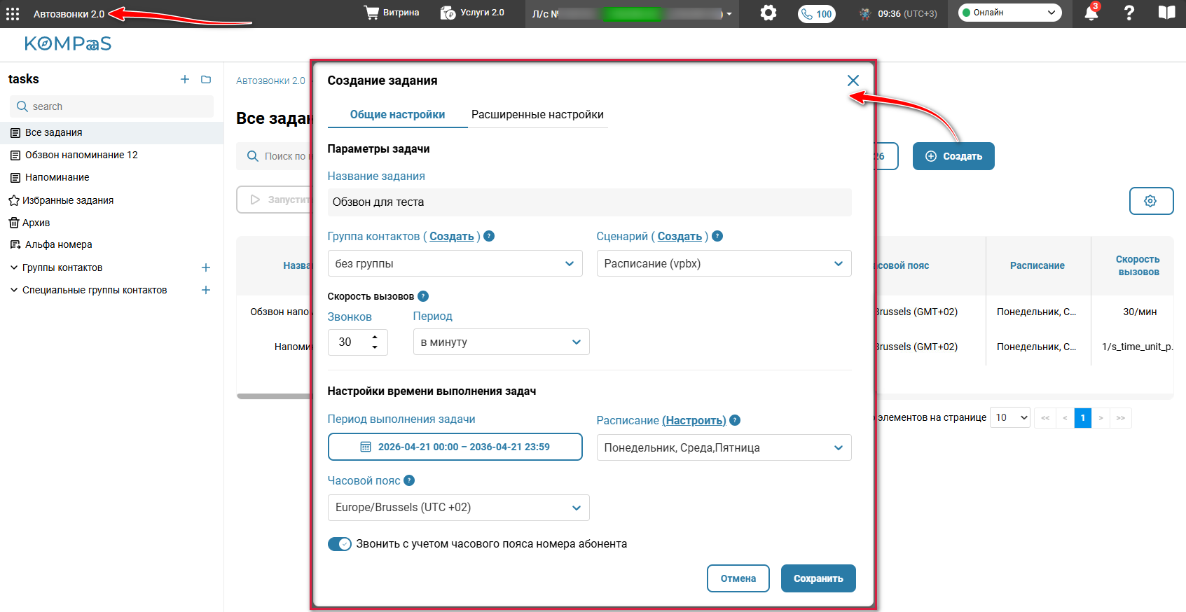Часовой пояс — по умолчанию при обзвоне учитывается часовой пояс ЛК.