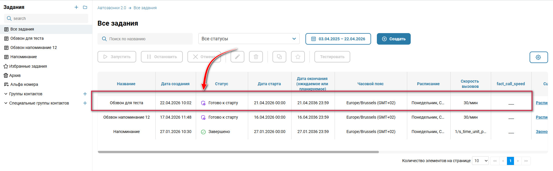 - Создать список контактов в разделе “Автозвонки 2.0” → “Специальные группы контактов”. Подробнее см. “Автозвонки 2.0 → Создание контактов”.