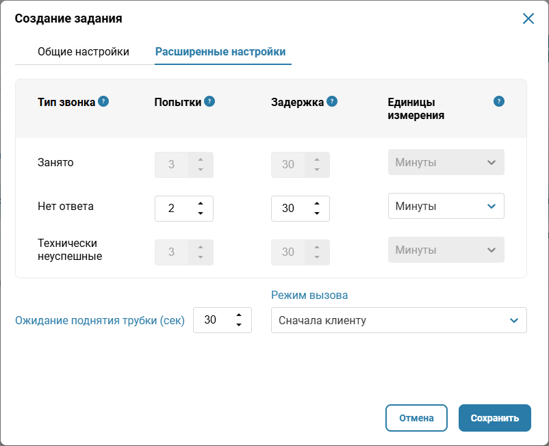 - Задержка — интервалы повторных попыток (например — при «занято» повтор через 30 минут).