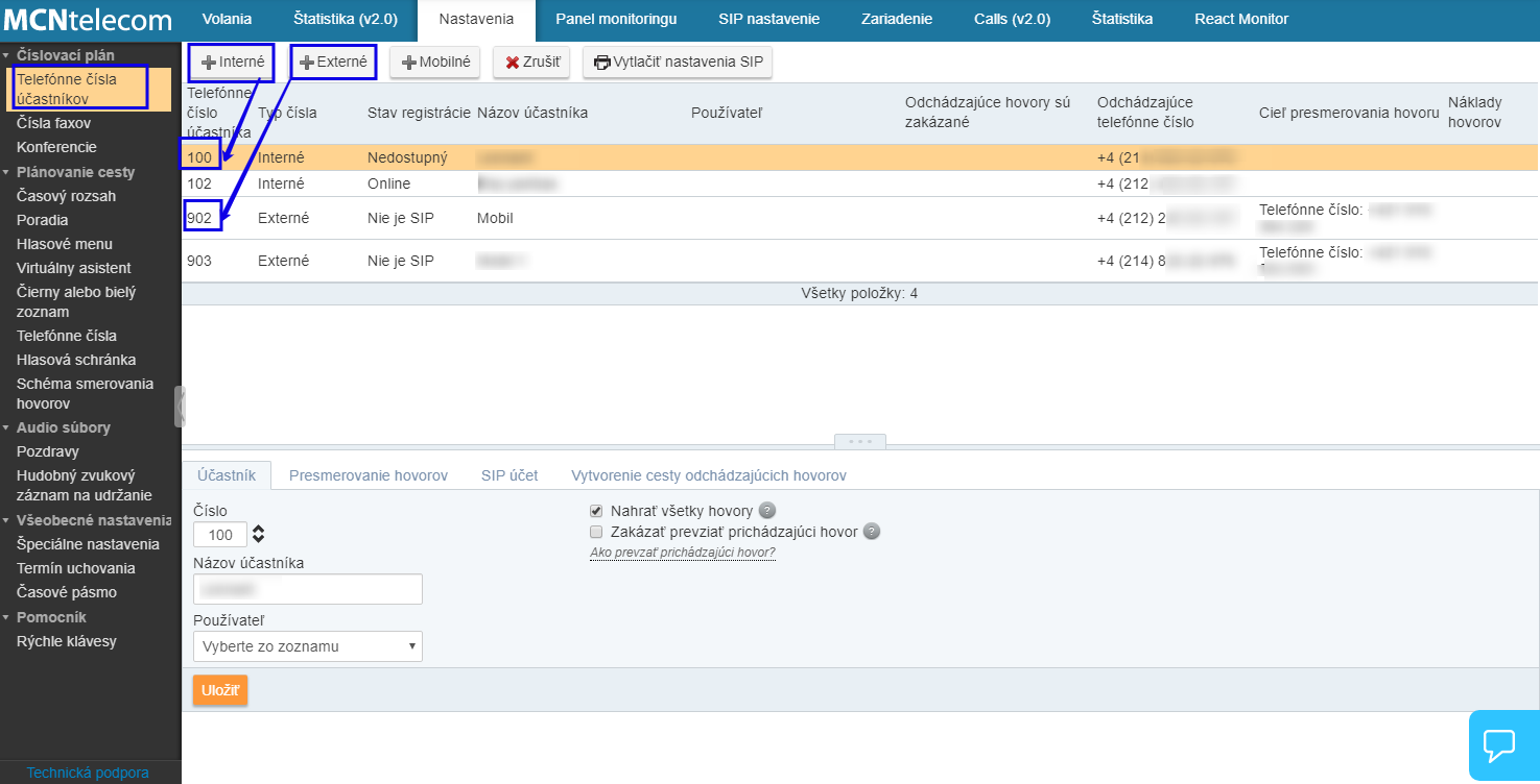 1. Kliknite na Virtuálna ústredňa | Nastavenia | Telefónne čísla účastníkov