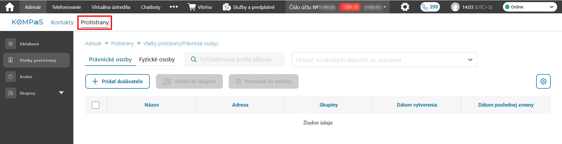 Pre začatie používania funkčnej časti „Protistrany“ prejdite do sekcie „Adresár“ → záložka „Protistrany“.